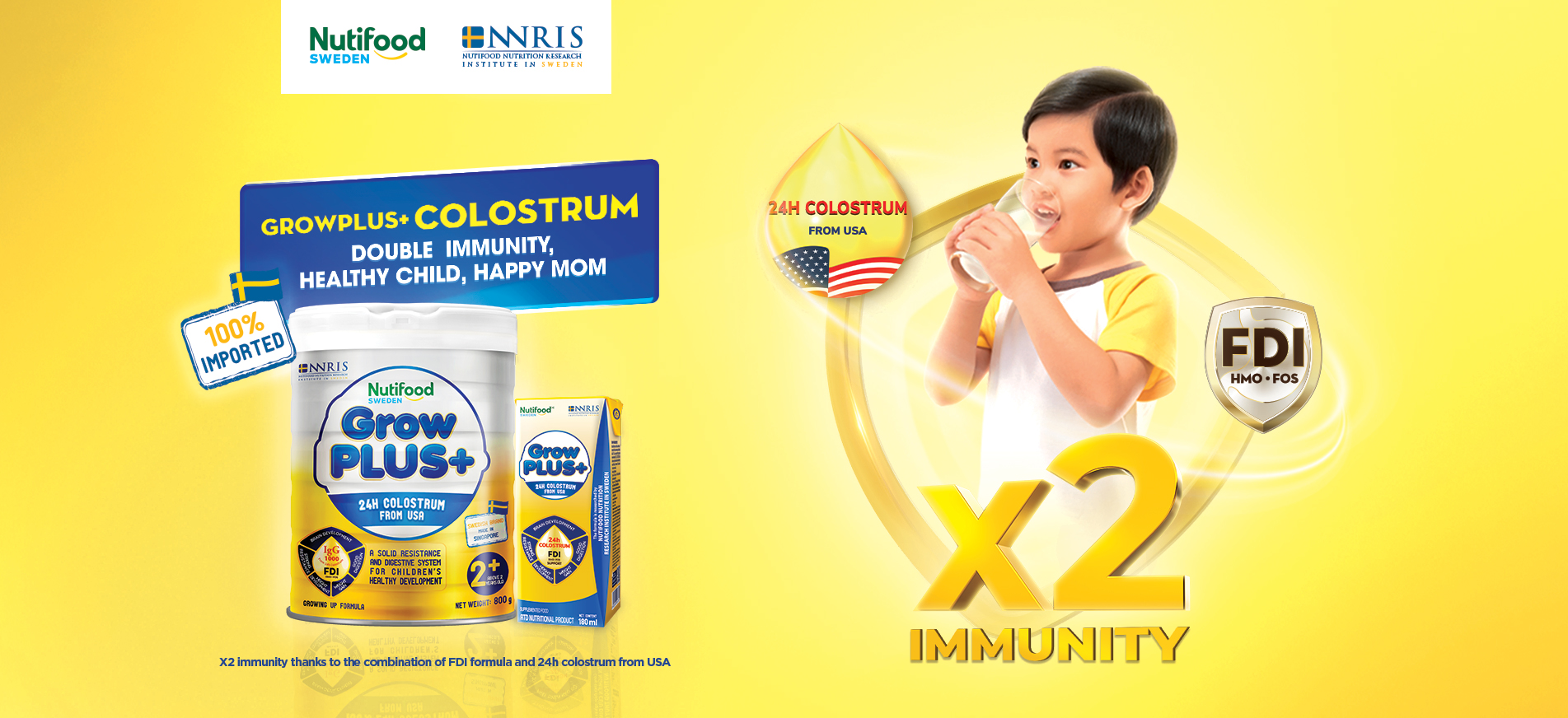 Nutifood Sweden GrowPLUS+ Sữa non là thương hiệu của Nutifood Thụy Điển với công thức được phát triển bởi Viện nghiên cứu dinh dưỡng Nutifood Thụy Điển (NNRIS), xây dựng nền tảng FDI (1) hỗ trợ Đề kháng khỏe, tiêu hóa tốt, giúp chuyển hóa tốt các dưỡng chất. Nay bổ sung Sữa non 24h tự nhiên từ Mỹ (2) với hàm lượng cao kháng thể IgG 1000 mg cùng 2'-FL HMO (3) giúp tăng cường đề kháng, cho bé phát triển khỏe mạnh.