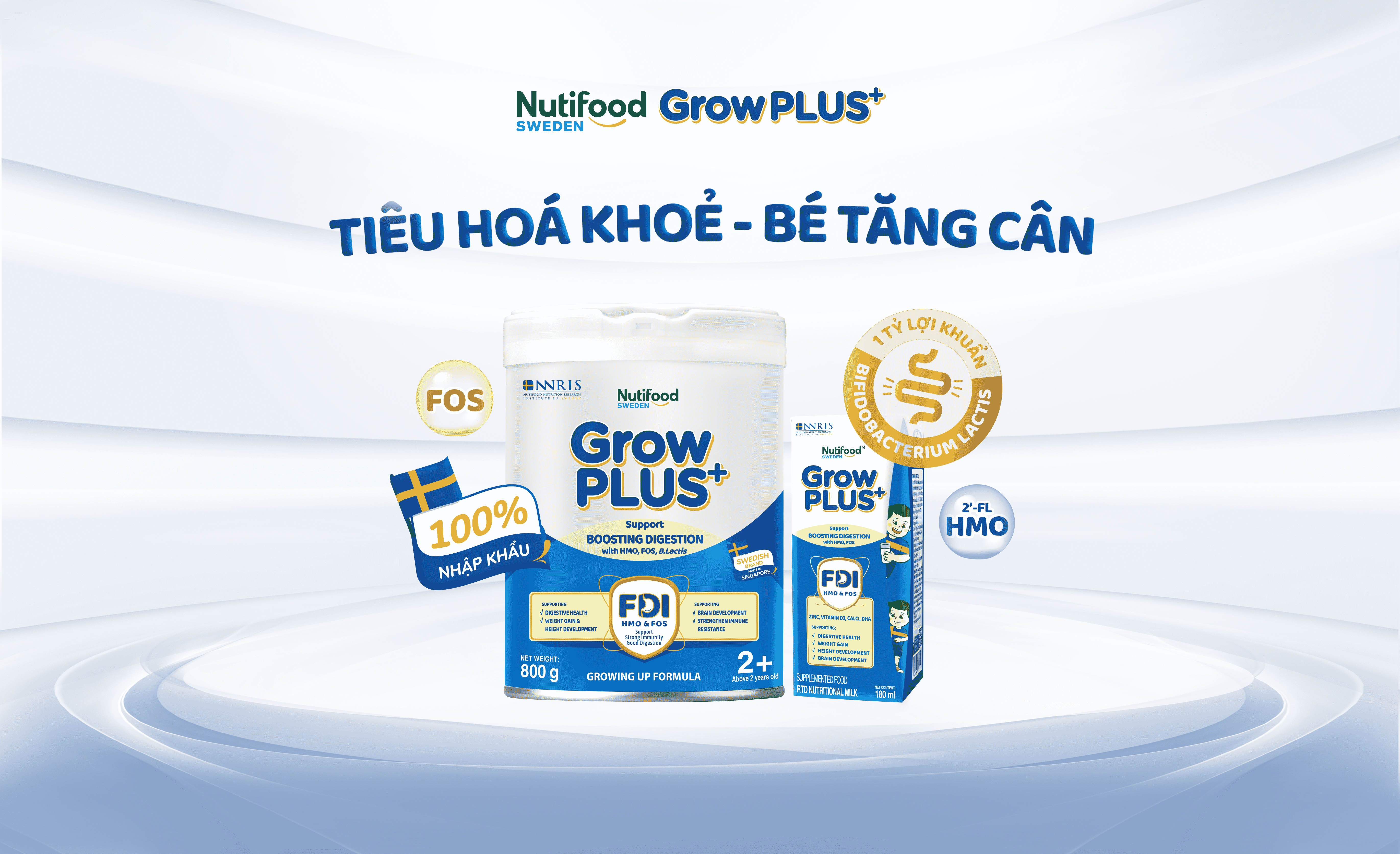 Nutifood GrowPLUS+ Tiêu hoá 100% nhập khẩu từ Singapore, được nghiên cứu bởi Viện nghiên cứu dinh dưỡng Nutifood Thuỵ Điển (NNRIS), phù hợp với nhu cầu dinh dưỡng của trẻ em Việt Nam.