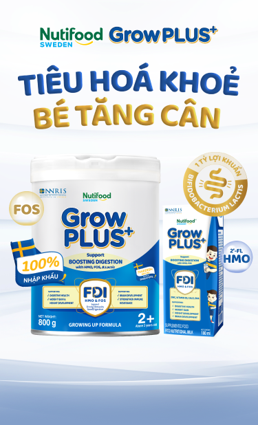 Nutifood GrowPLUS+ với công thức được phát triển bởi Nutifood Thụy Điển, xây dựng nền tảng FDI Đề kháng khỏe, Tiêu hóa tốt.